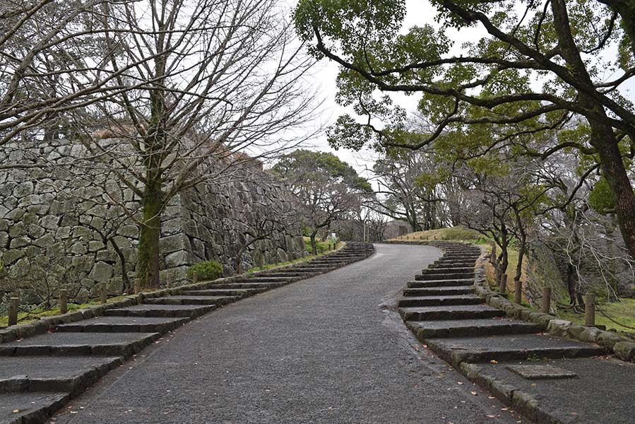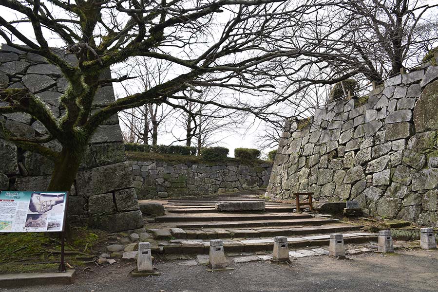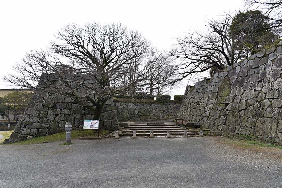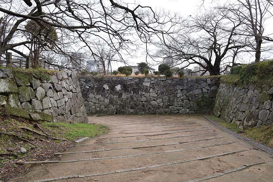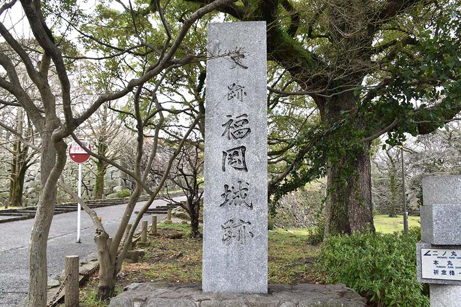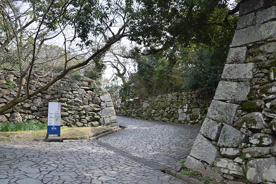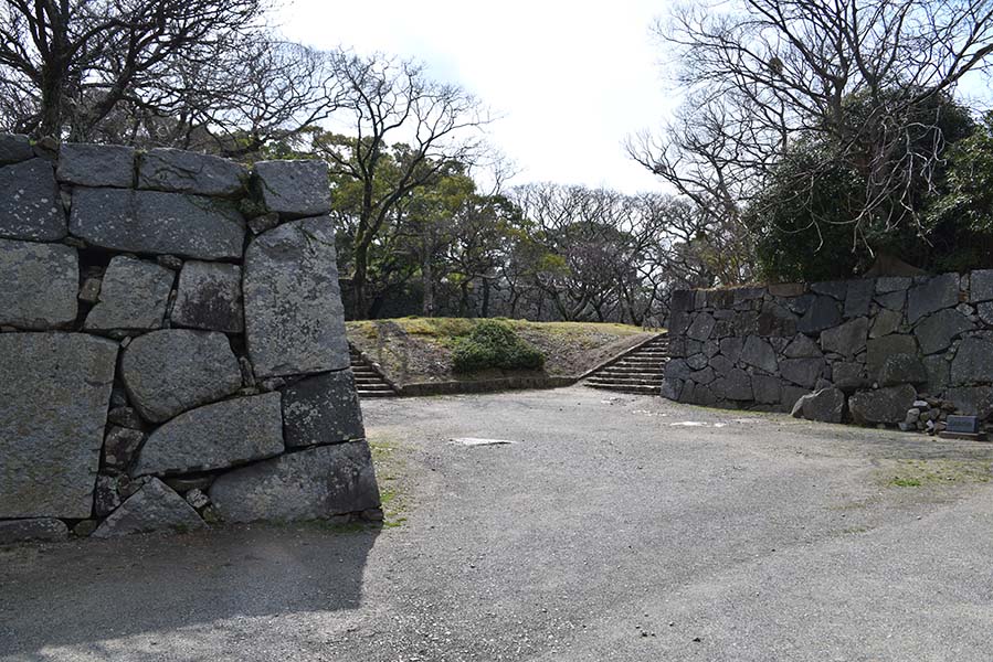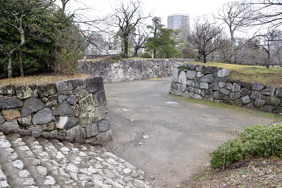 二の丸の北西隅に設けられた三の丸との間の門。当時は坂を上った場所に重厚な櫓門が建てられていたが、現在は石垣が残るのみ。立派な通路が設けられてしまっているので、だいぶ改変されてしまっているだろう。この通路の下に福岡城跡の石碑が建てられている。現在はこちらから登城する人の方が多そう。