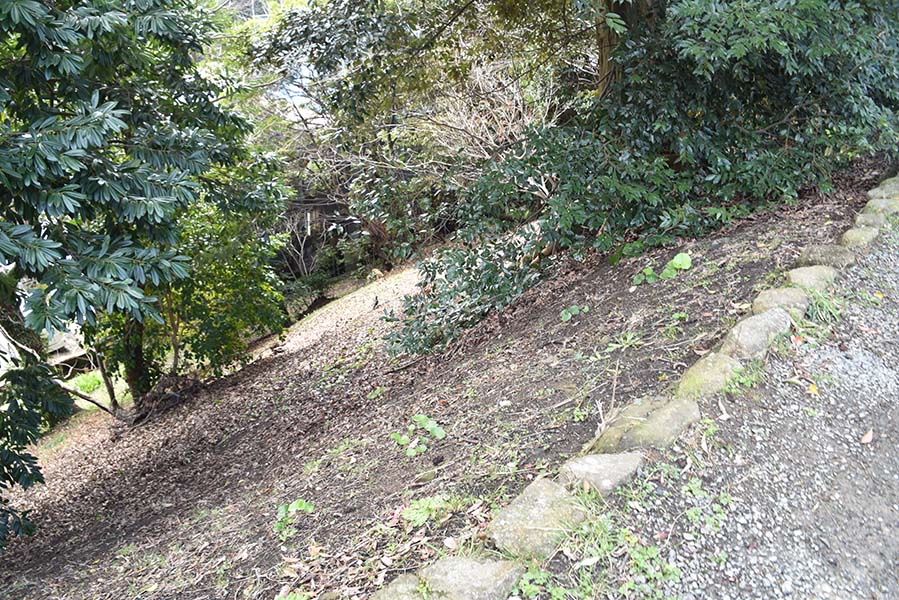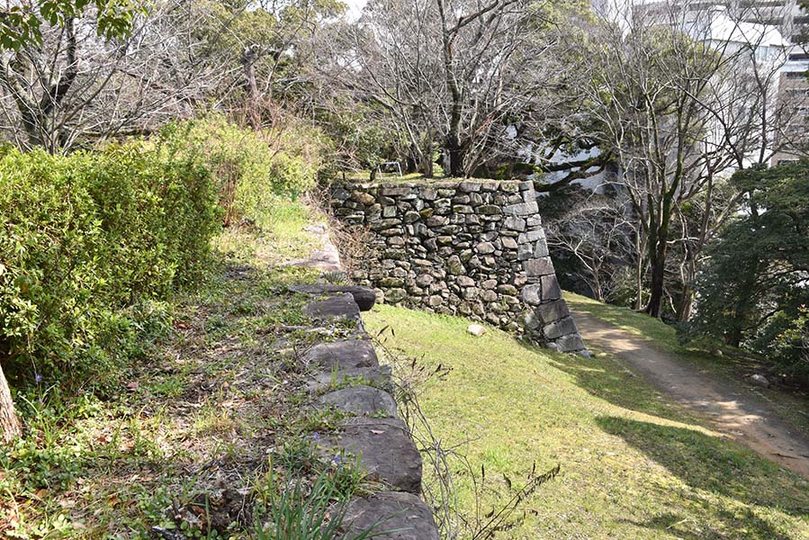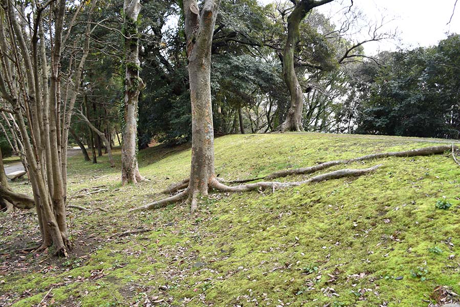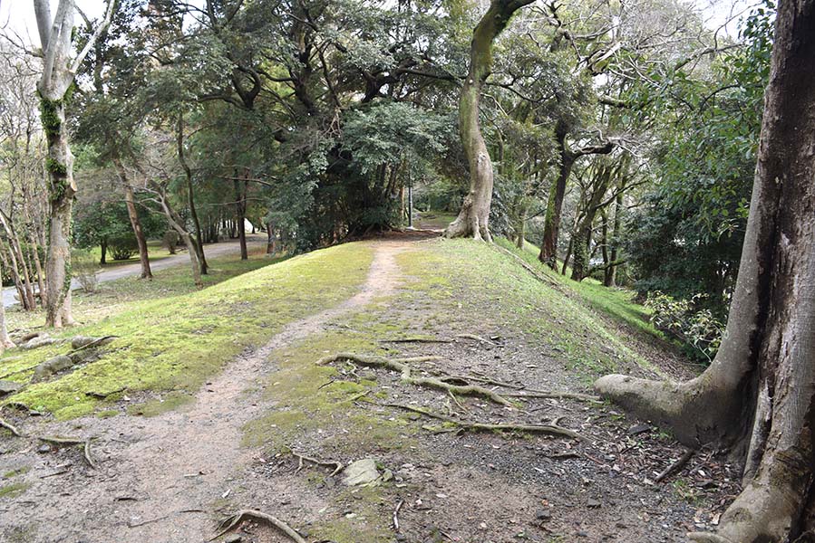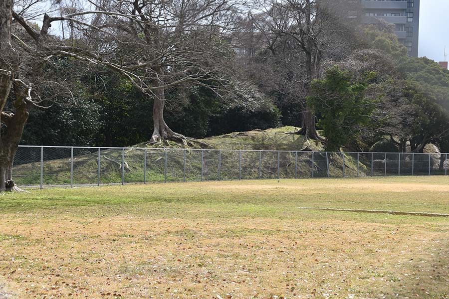 二の丸南側に築かれている土塁。城内側からは高さ1m程であまり高くないが、外側とはかなりの高低差がある。現在は埋め立てられているが、当時は水堀だった。