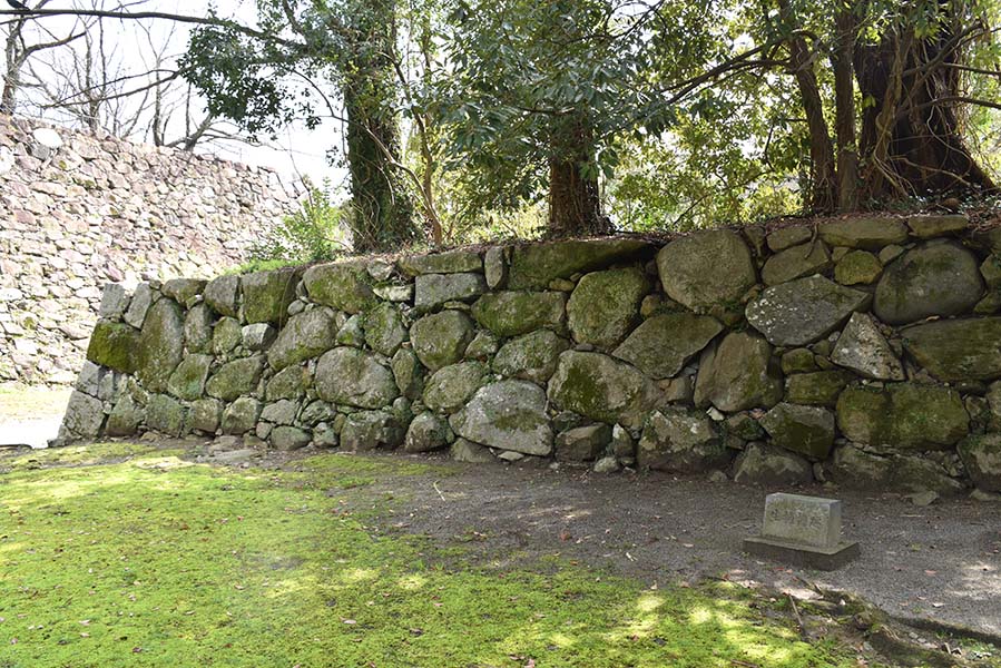 二の丸西側にも高さ7~8m程の見事な石垣が残る。この面の石垣は自然石を用いた野面積みで、古そう。同じ二の丸でもだいぶ積まれた時期に違いがあるっぽい。修築を繰り返していたのだろうか。