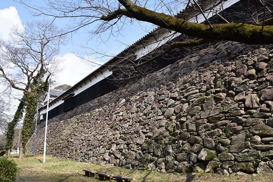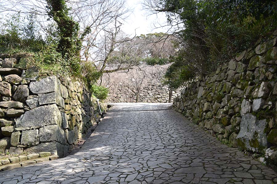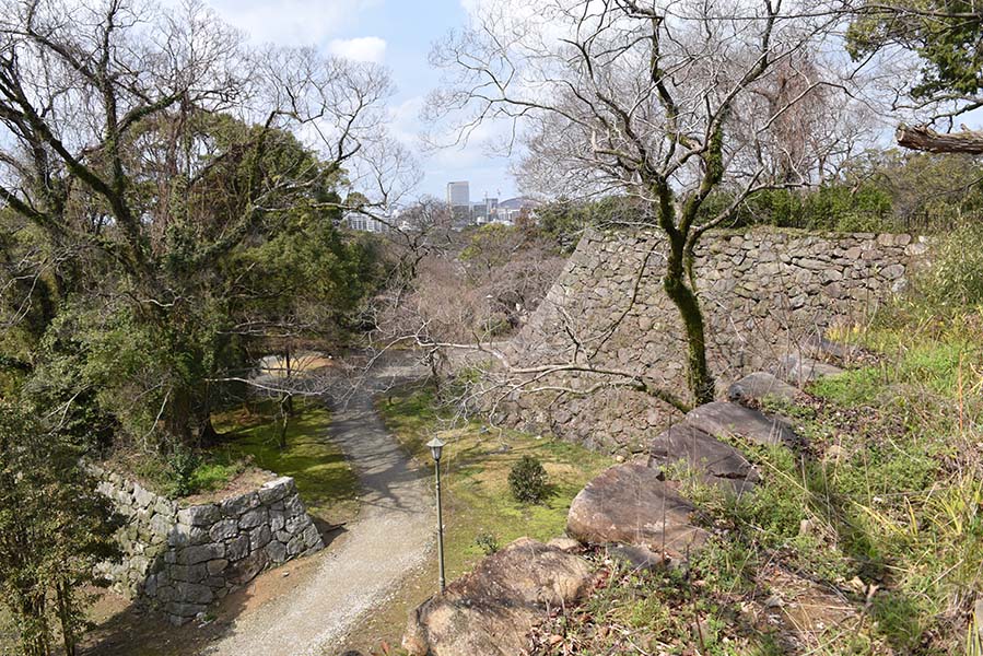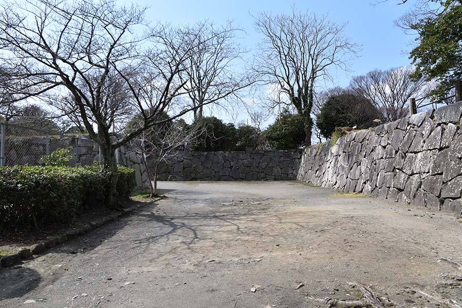 本丸の周囲を取り囲む二の丸。扇坂御門を入った北側部分は現在梅林となっており、周囲には高さ10m以上に及ぶ見事な石垣が築かれ、三の丸との間を隔てている。この辺りの石垣は切石が隙間無く積まれており、比較的新しい時期のものに見える。