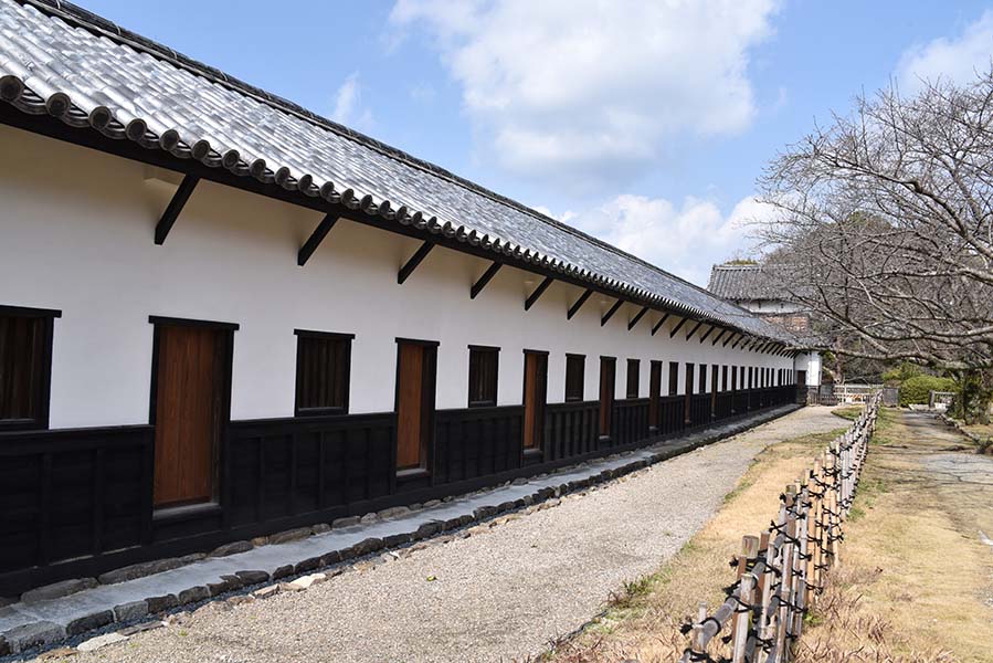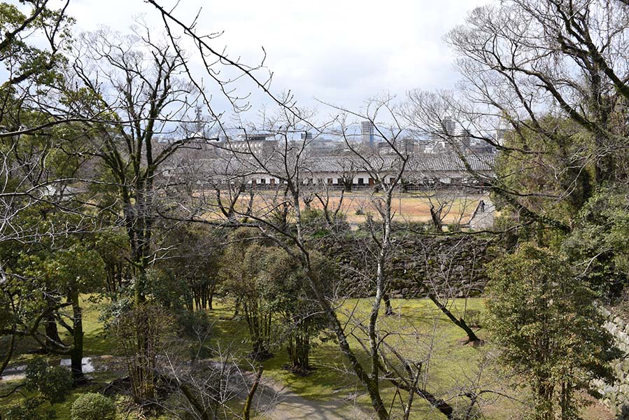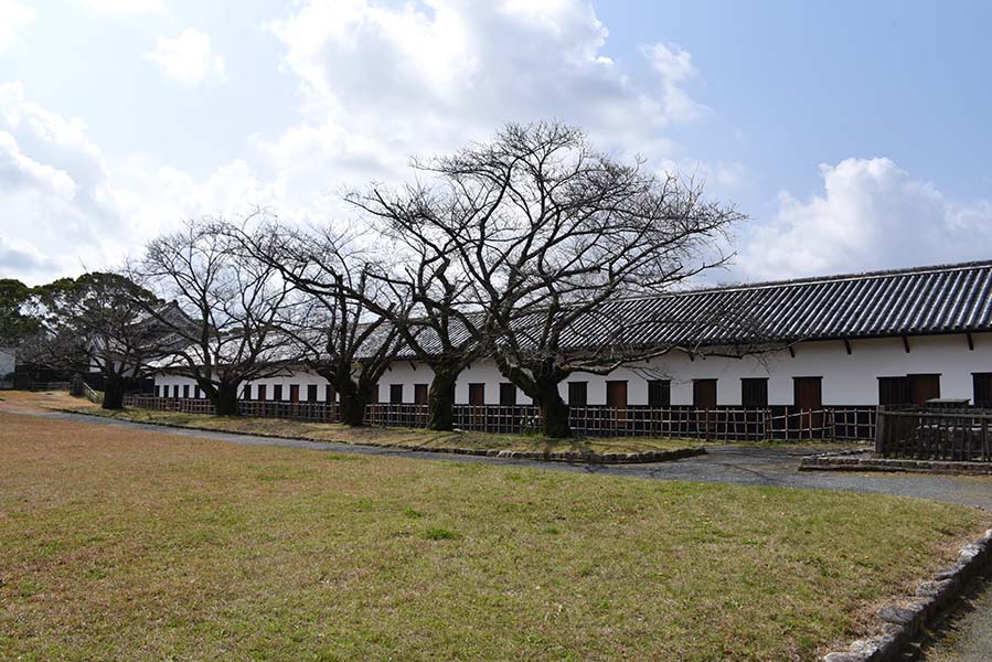 南二の丸の西側石垣上全面にわたって現存している多門櫓。現在見られる建物は嘉永6年(1853)に建て替えられたもので、30間(約54m)に及ぶ長大な平櫓が北隅櫓と西隅櫓との間を繋いでいる。外面には石落としを設け、内部は16の小部屋に仕切られており、戦後の一時期は大学の学生寮になった時期もあったらしい。現在は重要文化財に指定されている。