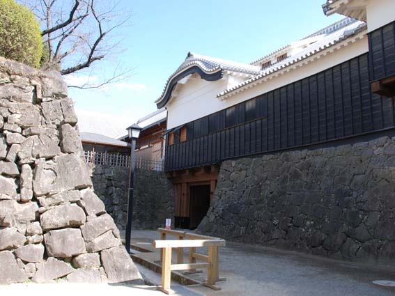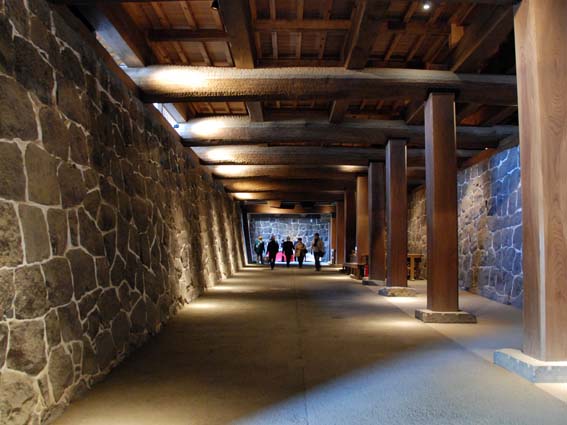 二つの石垣をまたぐように建つ本丸御殿の下は地下通路となっている。昼間でも暗い事から