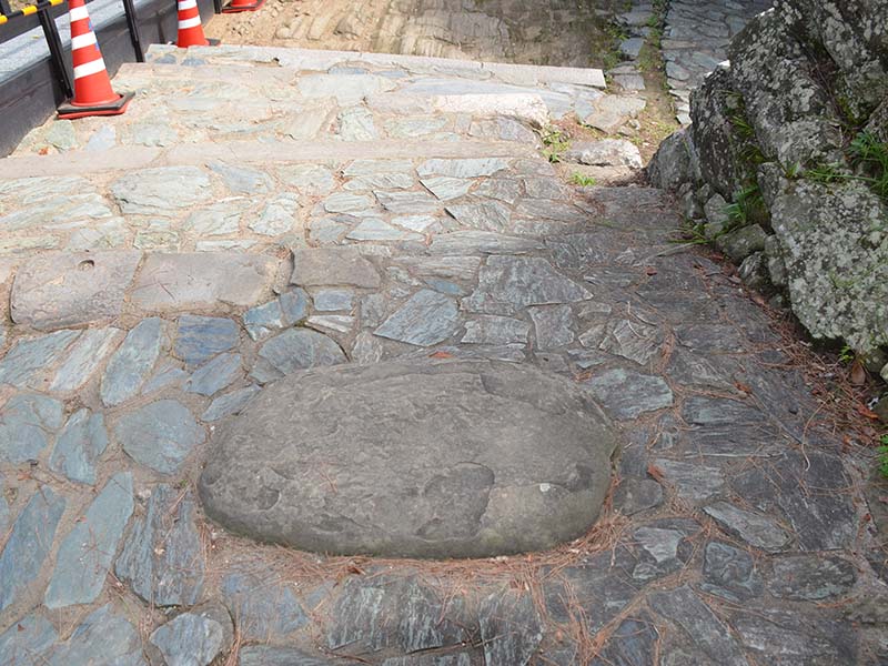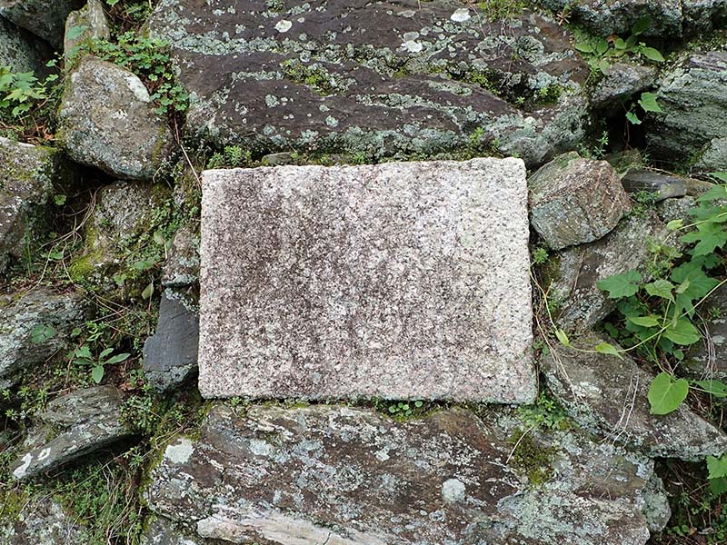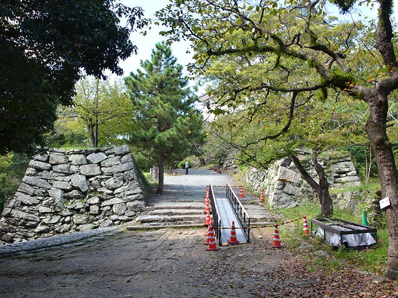 天守曲輪のある西峰の東端、本丸との間に設けられていた天守一の門跡。両側の石垣とともに門の礎石も残っている。この東側に本丸御殿が建てられていてた。