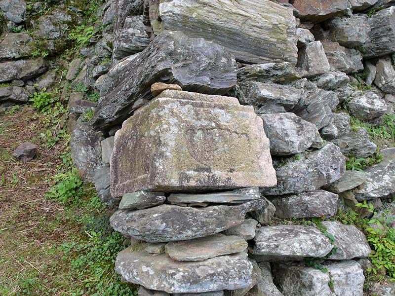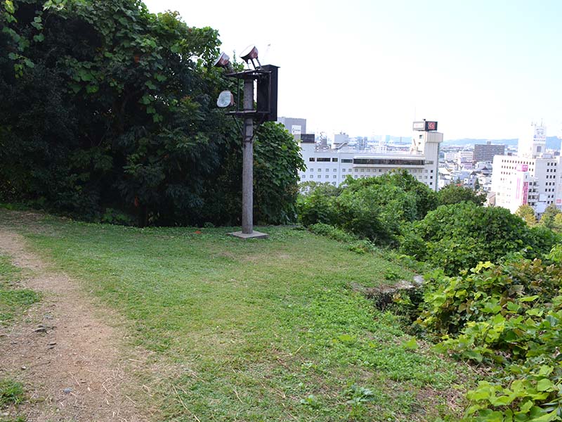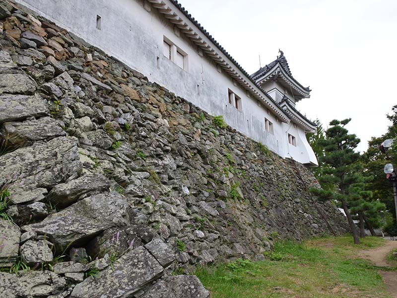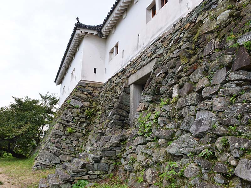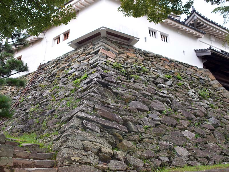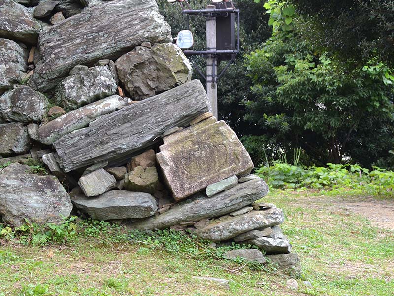 天守曲輪の石垣は、天守再建時にも積み直されなかったようで、築城当初の古い石垣が残っている。隅部には宝篋印塔の台座などの転用石が見られる。