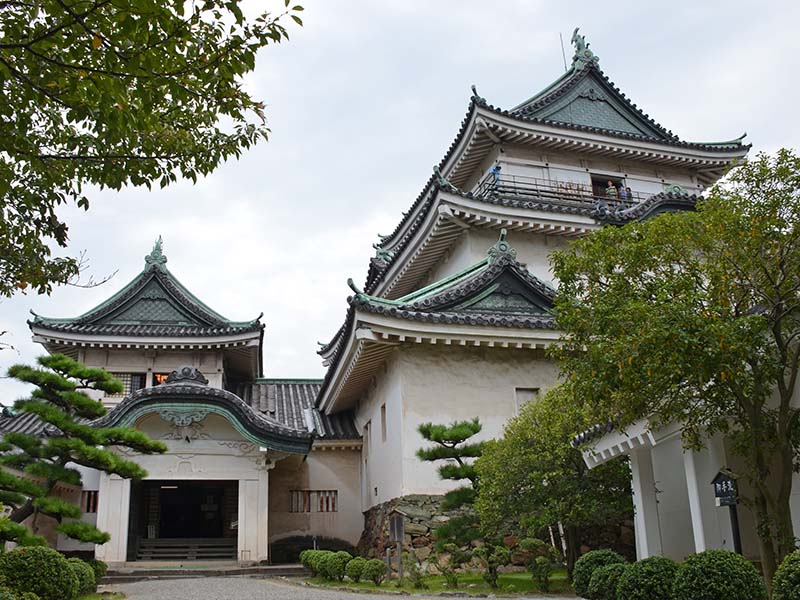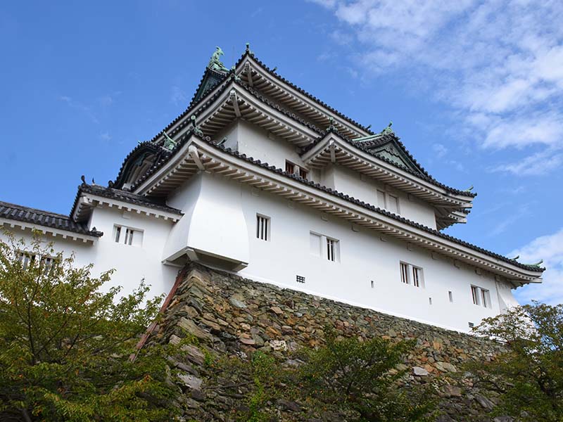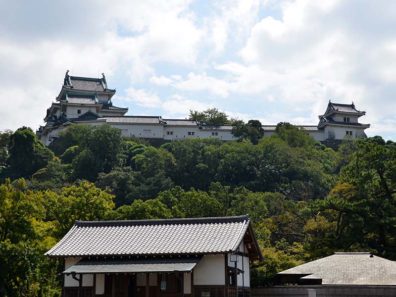 標高49mの虎伏山の西峰山頂に建てられている天守曲輪。最初の天守は浅野幸長時代に建てられ、この頃山上の曲輪郡も整備された。大天守・小天守の他、乾櫓、二之門櫓が建てられ、それらを多門櫓で繋いだ堅固な造りだったが、弘化3年(1846)に落雷により焼失した。通常、天守の再建は許可されなかったが、御三家と言う事で『有形の通り』との条件付きで許可され、嘉永3年(1850)に再建された。明治期に廃城後になったも天守は残り旧国宝に指定されていたが、昭和20年7月の和歌山大空襲で全焼した。現在見られる天守は、昭和33年に鉄筋コンクリートで建てられたものだが、外観は焼失前の天守に復元されている。